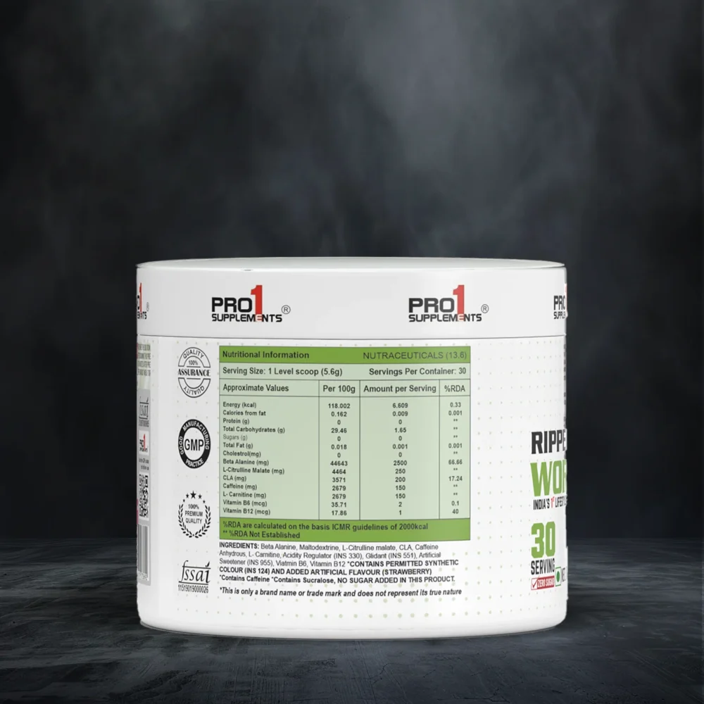 Enhance your workout performance with Pro1 Supplements Ripped Pre Workout – Strawberry Flavour, a powerful pre-training formula designed to boost energy, endurance, and fat metabolism. With ingredients like Beta Alanine, L-Citrulline Malate, CLA, Caffeine, and L-Carnitine, this advanced pre-workout helps improve focus, stamina, and workout intensity while supporting fat loss and muscle performance.