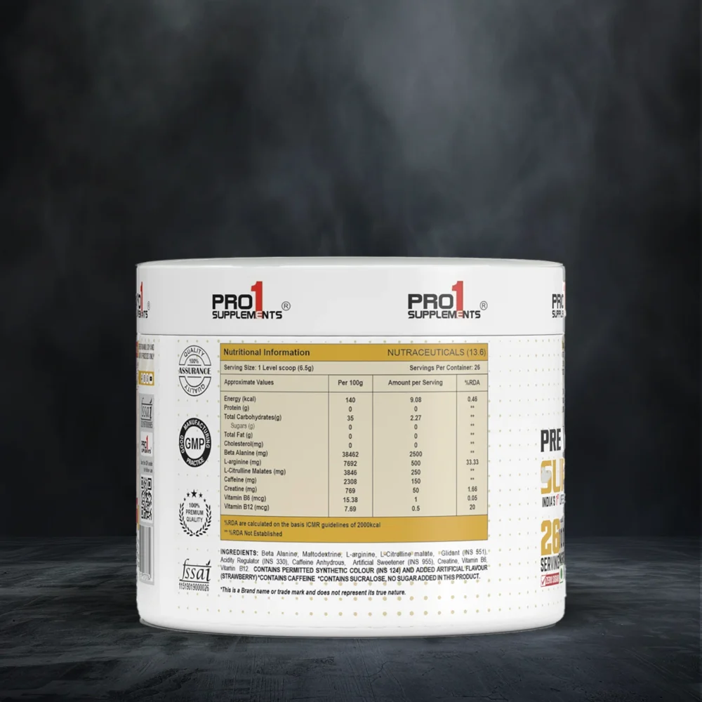 Maximize your workout performance with Pro1 Supplements Pre Workout Super Pump – Strawberry Flavour, an advanced pre-training formula designed to increase energy, endurance, and muscle pumps. With powerful ingredients like Beta Alanine, L-Arginine, L-Citrulline Malate, Creatine, and Caffeine, it helps enhance strength, focus, and workout intensity for better training results.