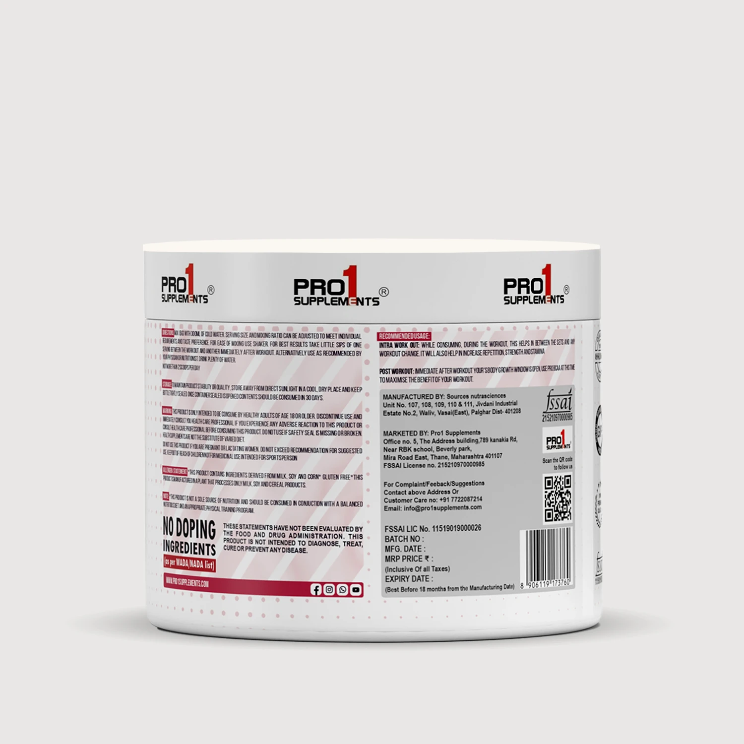 Branched Chain Amino Acids (L-Leucine, L-Isoleucine, L-Valine), Maltodextrin, Sodium Chloride, Potassium Chloride, Artificial Sweetener (INS 955), Acidity Regulator (INS 330), Permitted Synthetic Colour (INS 133), Added Artificial Flavour (Blueberry).