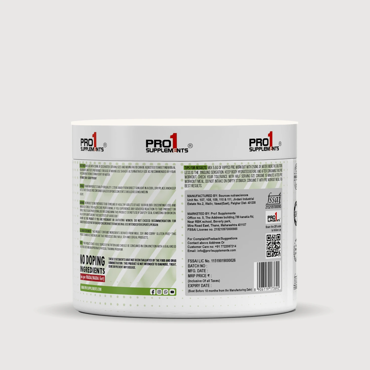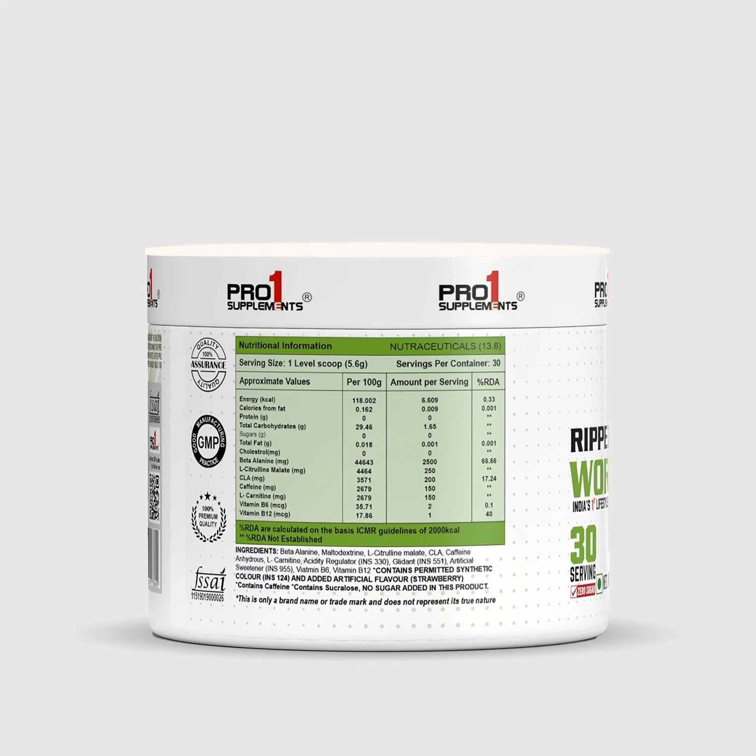 Enhance your workout performance with Pro1 Supplements Ripped Pre Workout – Strawberry Flavour, a powerful pre-training formula designed to boost energy, endurance, and fat metabolism. With ingredients like Beta Alanine, L-Citrulline Malate, CLA, Caffeine, and L-Carnitine, this advanced pre-workout helps improve focus, stamina, and workout intensity while supporting fat loss and muscle performance.